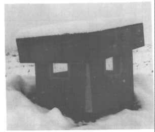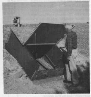 * Quick installation post-attack, after fallout decays sufficiently. In an installation test, dirt was dug away to expose the upper 12 inches of the emergency exit shaft. Then in just 8 minutes the author and a boy carried the 5 parts of this exit housing 80 feet, positioned its four walls around the already exposed upper 12 inches of the reinforced concrete emergency exit, nailed its walls together, and placed its adjustable top in the tilted position pictured in Fig. F.1.