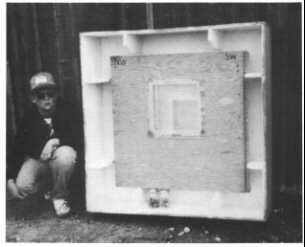 The uppermost of the two large covering pieces of chipboard (or exterior plywood) rests on the opened doors and is kept from slipping down by a 1 x 2-inch board nailed 4 inches from its upper end. This small board "hooks" over the upper edge of the piece of chipboard (or plywood) attached to the upper ends of the steel doors. (See the drawing on the side of this column.) This large piece of chipboard is securely tied to the doors.